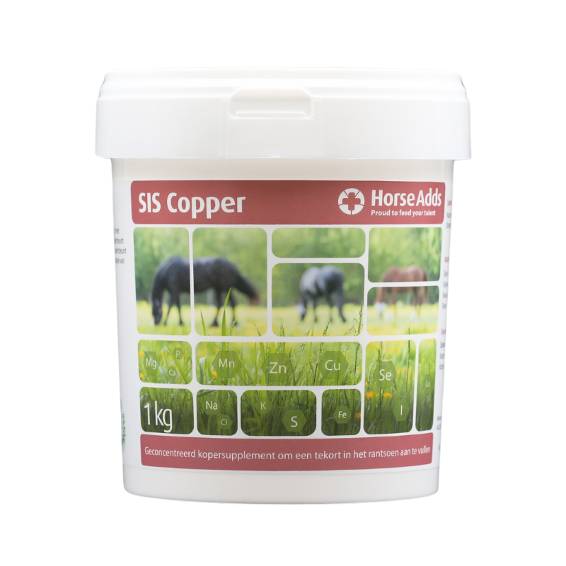 Koper speelt bij paarden een belangrijke rol bij het ijzertransport in het lichaam en bevordert de opname van ijzer in het bloed. Koper ondersteunt het immuunsysteem en draagt bij aan de bescherming van cellen tegen vrije radicalen. Een juiste concentratie koper ondersteunt het bindweefsel en draagt bij tot een normale pigmentatie van het huid en haar. Met Horse Adds SIS Copper kan je heel gericht koper toevoegen aan het dagelijks rantsoen wanneer dit nodig is.